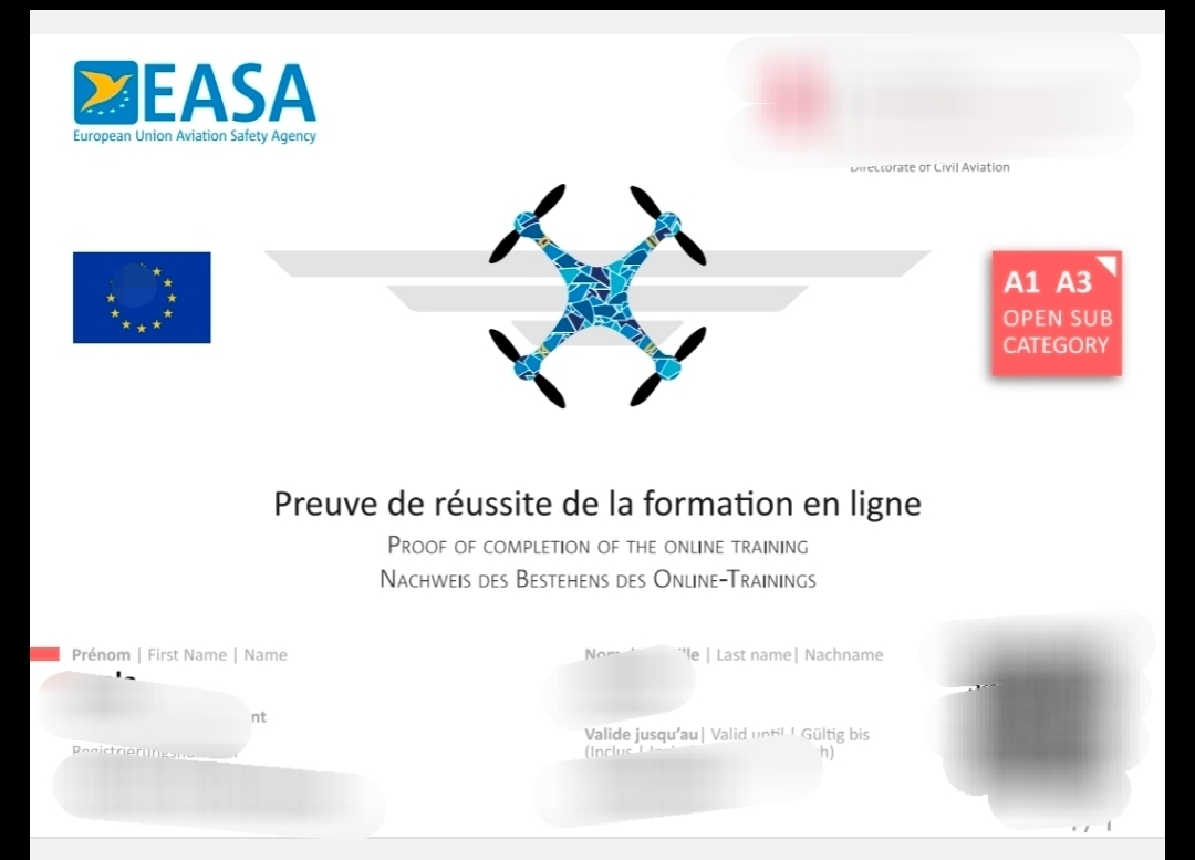"Immagine oscurata per motivi di privacy. Certificato UAS A1-A3 regolarmente conseguito e disponibile su richiesta per verifiche professionali."